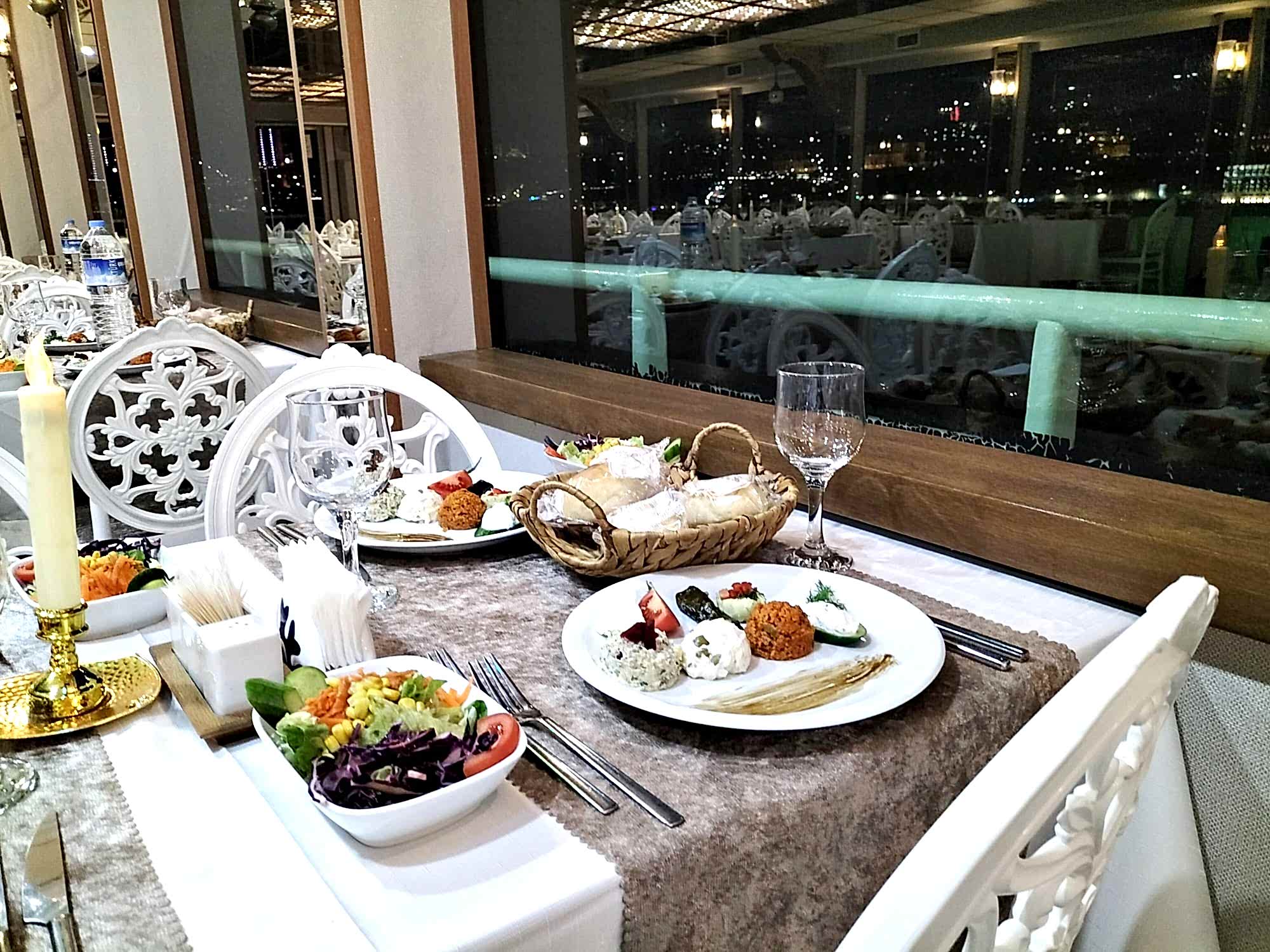 This is an absolutely great way to see Istanbul. The bridge over the Bosphorus strait is amazing to view from any angle. In fact it is (I think) one of those pictures that temporarily shows, when your computer’s Windows displays places in the world. Seeing the bridge lit up at night on the yacht is an entirely different, but equally impressive spectacle. The dinner starts off with a plate of 3 different dips when you sit down. Then there are three other courses, all of which were quite good. Most would probably agree that the music entertainment is the high point. Both singers and dancers. And you can always go outside and take in the beauty of the lighted buildings on the banks of the Bosphorous. The evening ended with the dancers encouraging diners to get up and dance. Great experience!