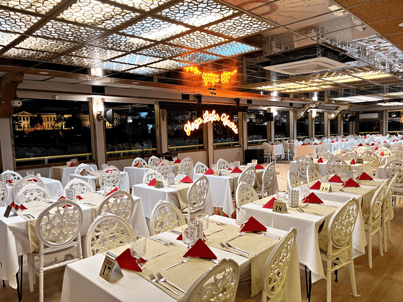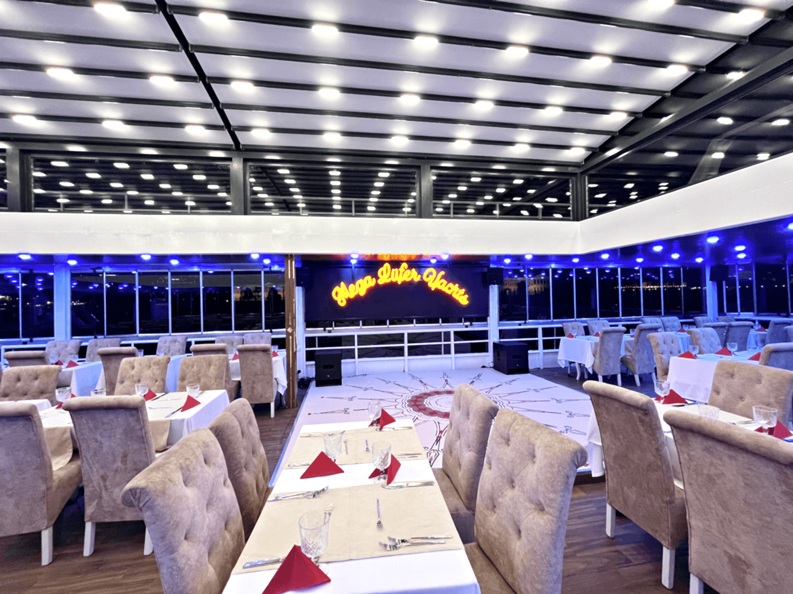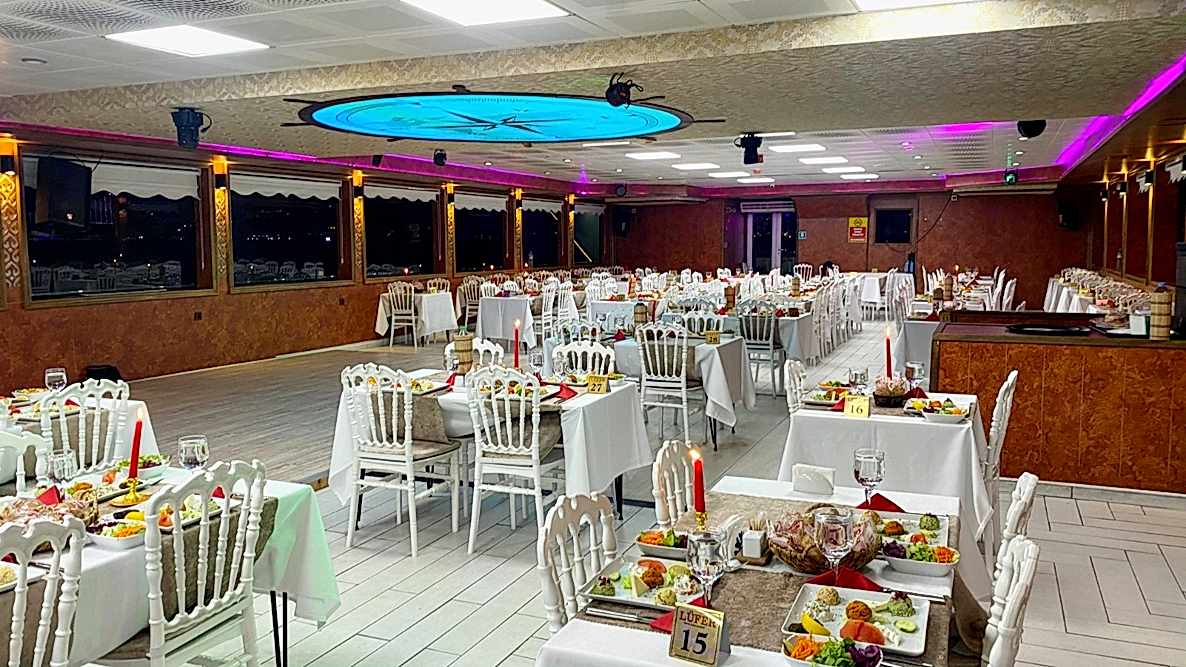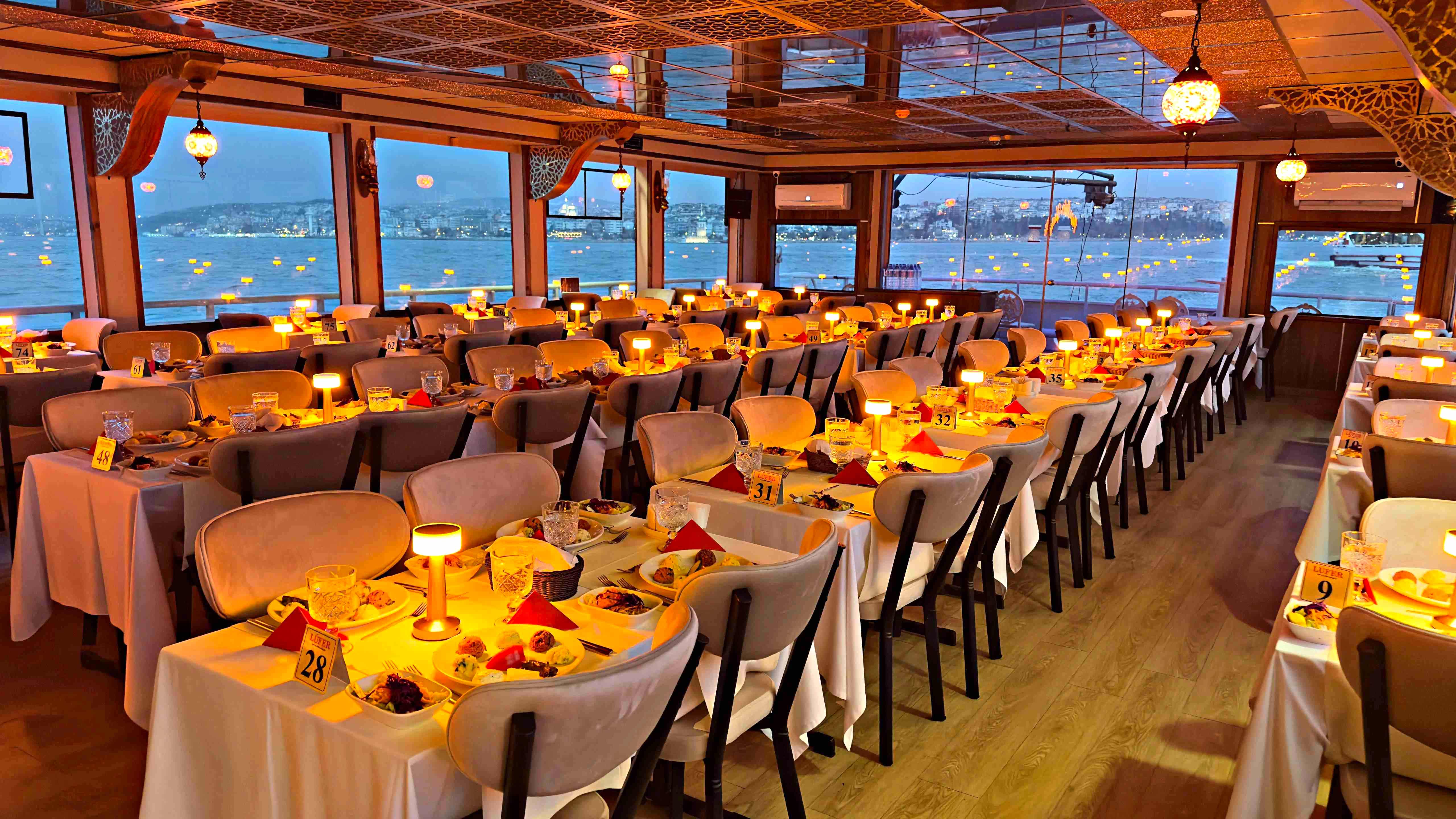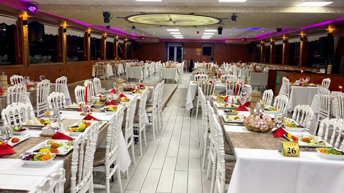As Lüfer Boats Group, for a privileged and perfect night with rich menu options, live music and stage performances in a sterile environment with our professional staff and corporate service approach, far from the fixed space image of crowded restaurants, on the most stylish, 3-storey, 500-person capacity boat of the Bosphorus. We will be happy to welcome your guests.