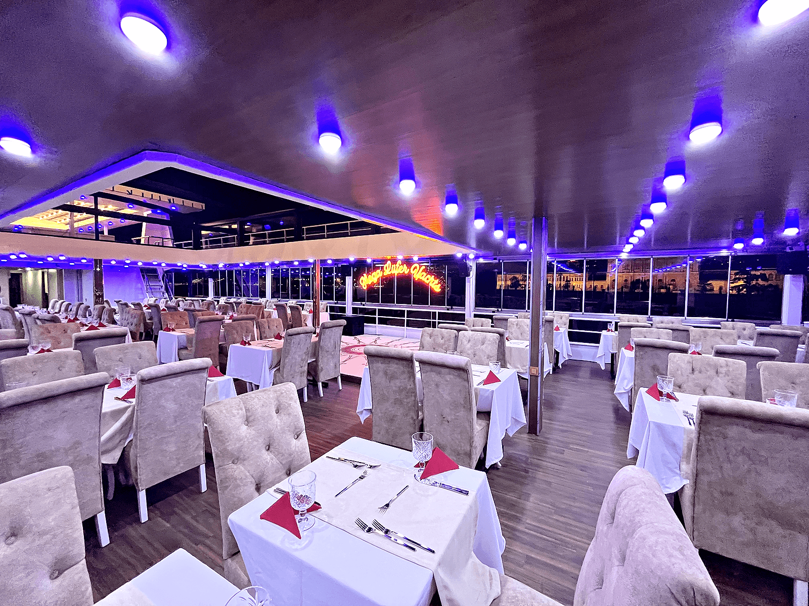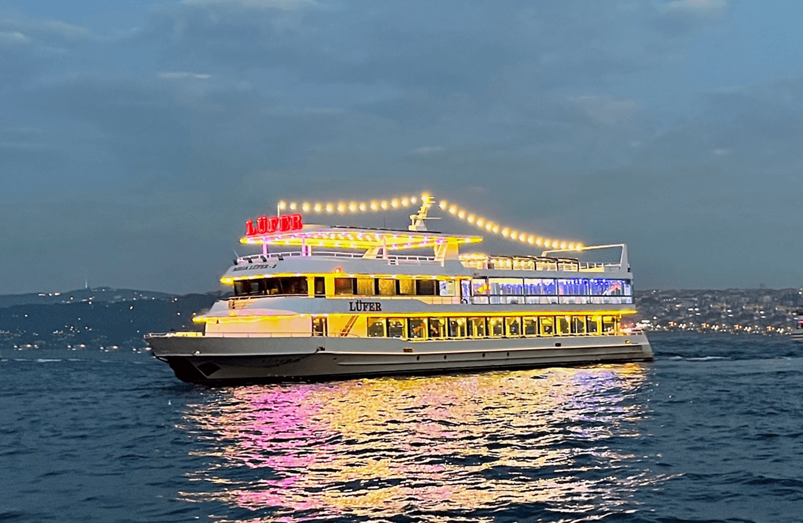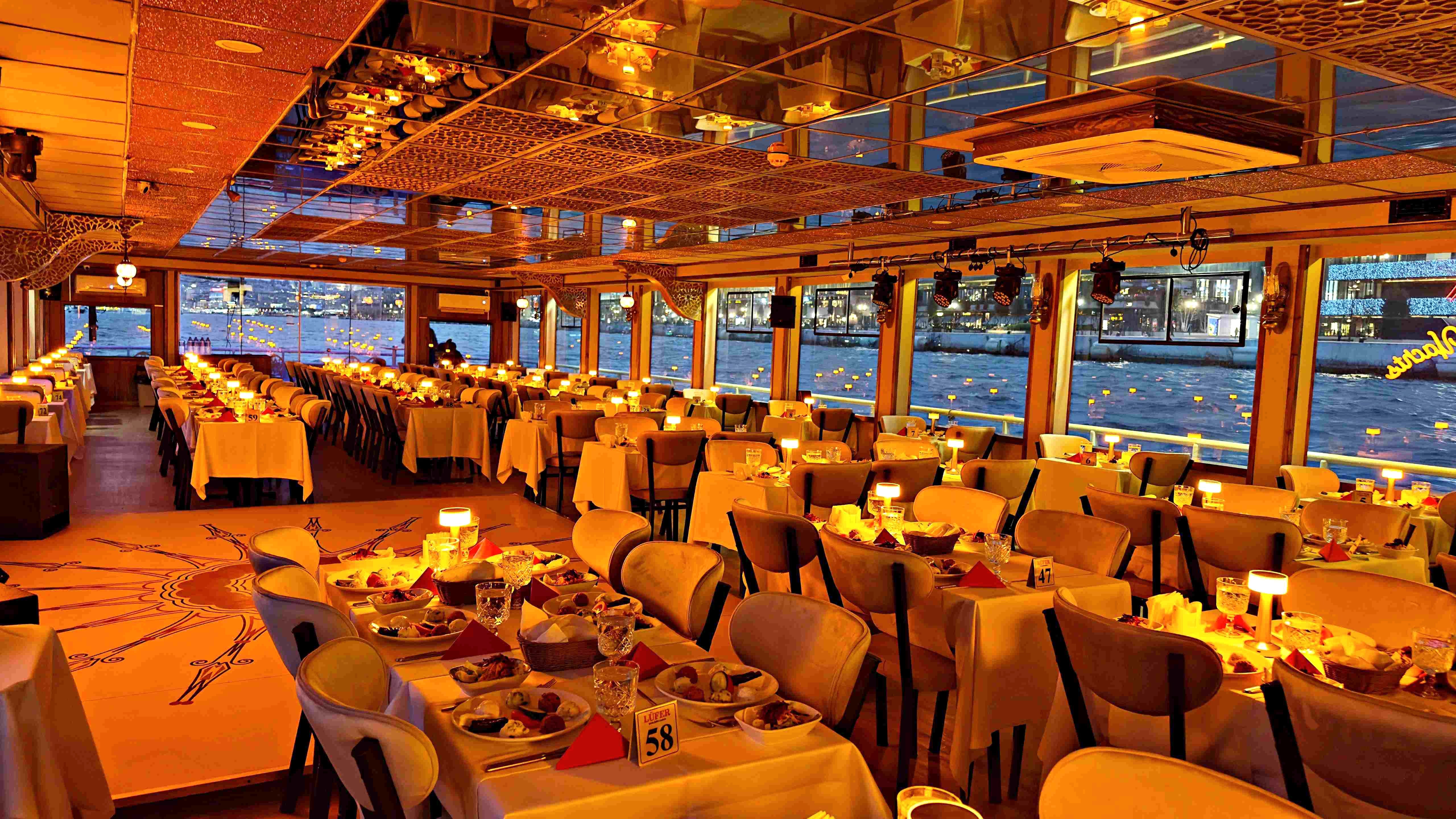 For 45 years, the first thing that comes to mind when talking about a boat tour on the Bosphorus is the MEGA LÜFER ship, Istanbul's only Safe Tourism Certified Tourist Boat, at private VIP tables in the glittering silhouette of the Maiden's Tower, Galata Tower, Ortaköy Mosque and Bosphorus Bridges along the coast on both sides of the Bosphorus. We are at your service to beautify your night with rich menu options and magnificent stage performances. We wish that not even one person will be deprived of the unique beauty of the Bosphorus, and we wish them to enjoy the Bosphorus by participating in our tours with definite departures every evening, by participating in the desired number of people.