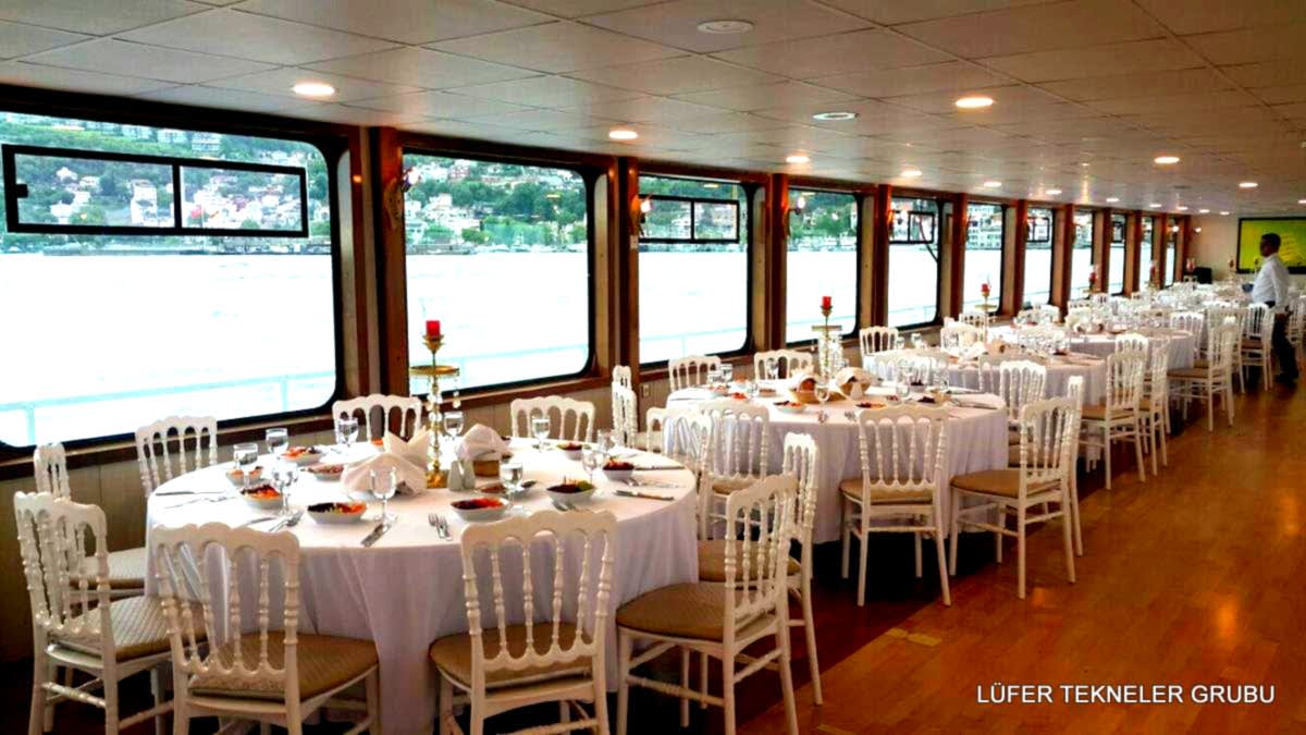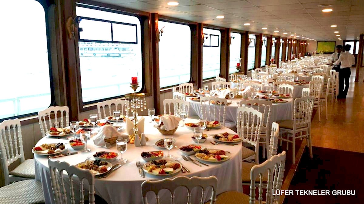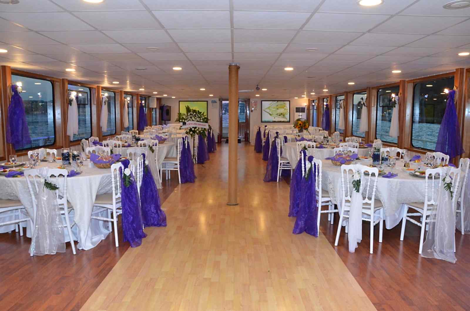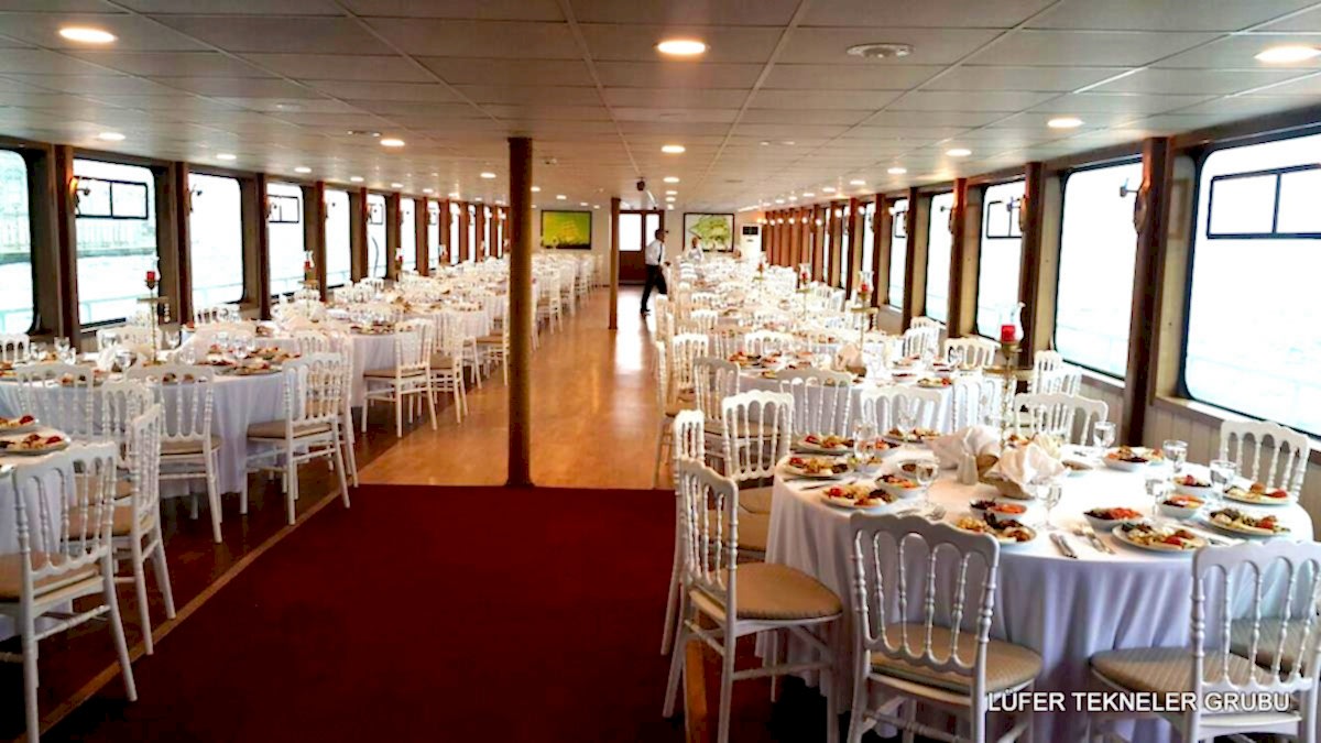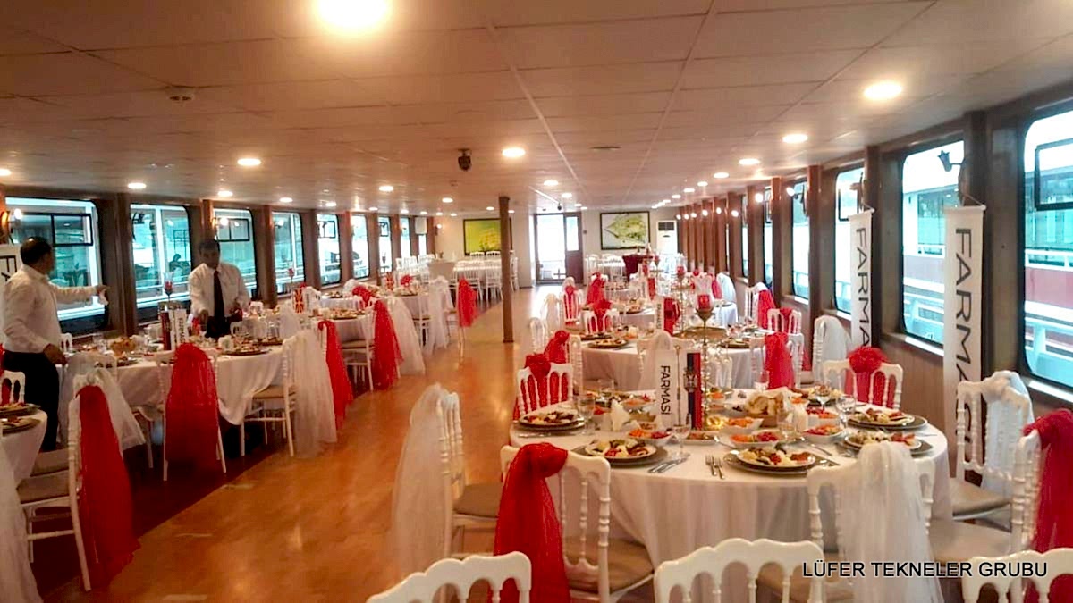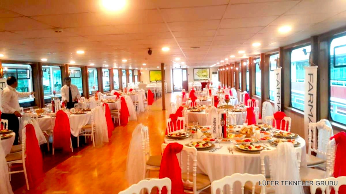 Yemekli Kapasite 250 Kişi , Kokteyl Kapasite 350 kişi .Günlük, saatlik ,akşam ,gündüz kiralık davet teknesi.